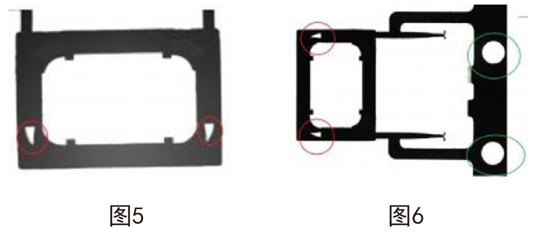 圖5,用普通的鏡頭拍攝,由于視覺誤差和聚焦不準,所以在拍攝塑膠模具的透氣孔時(紅圈圈定),出現內壁可見,邊緣提取不清晰,有陰影的現象,對識別造成影響,數據不準確。