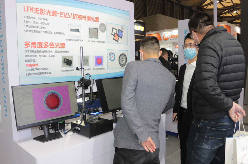 方案展示區(qū)主要有:手機屏幕表面缺陷檢測(多角度線光源)、凹凸/折痕檢測(LFM無影光源)、增亮頻閃控制器應用、輪流頻發(fā)控制器應用等。